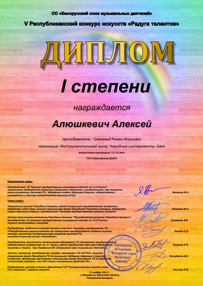 Диплом I степени – Алюшкевич Алексей (учитель Гуменный Р.Я.);