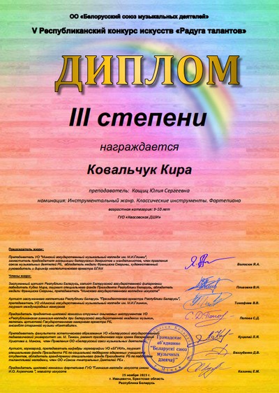 Диплом III степени – Ковальчук Кира (учитель Кощиц Ю.С.).
