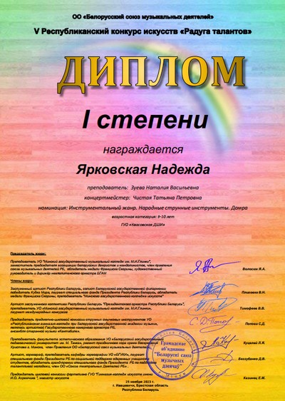 Диплом I степени – Ярковская Надежда (учитель Зуева Н.В., концертмейстер Чистая Т.П.);