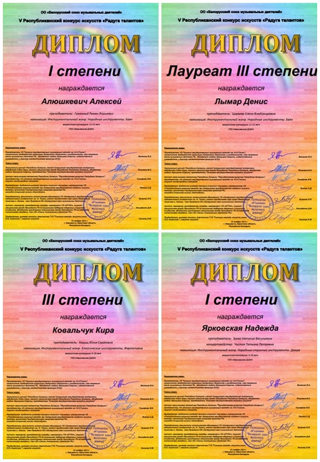 Профессиональное жюри, в состав которого вошли заслуженные деятели культуры, известные артисты, педагоги специализированных учебных заведений, положительно оценило выступления юных музыкантов, присудив им следующие награды:
