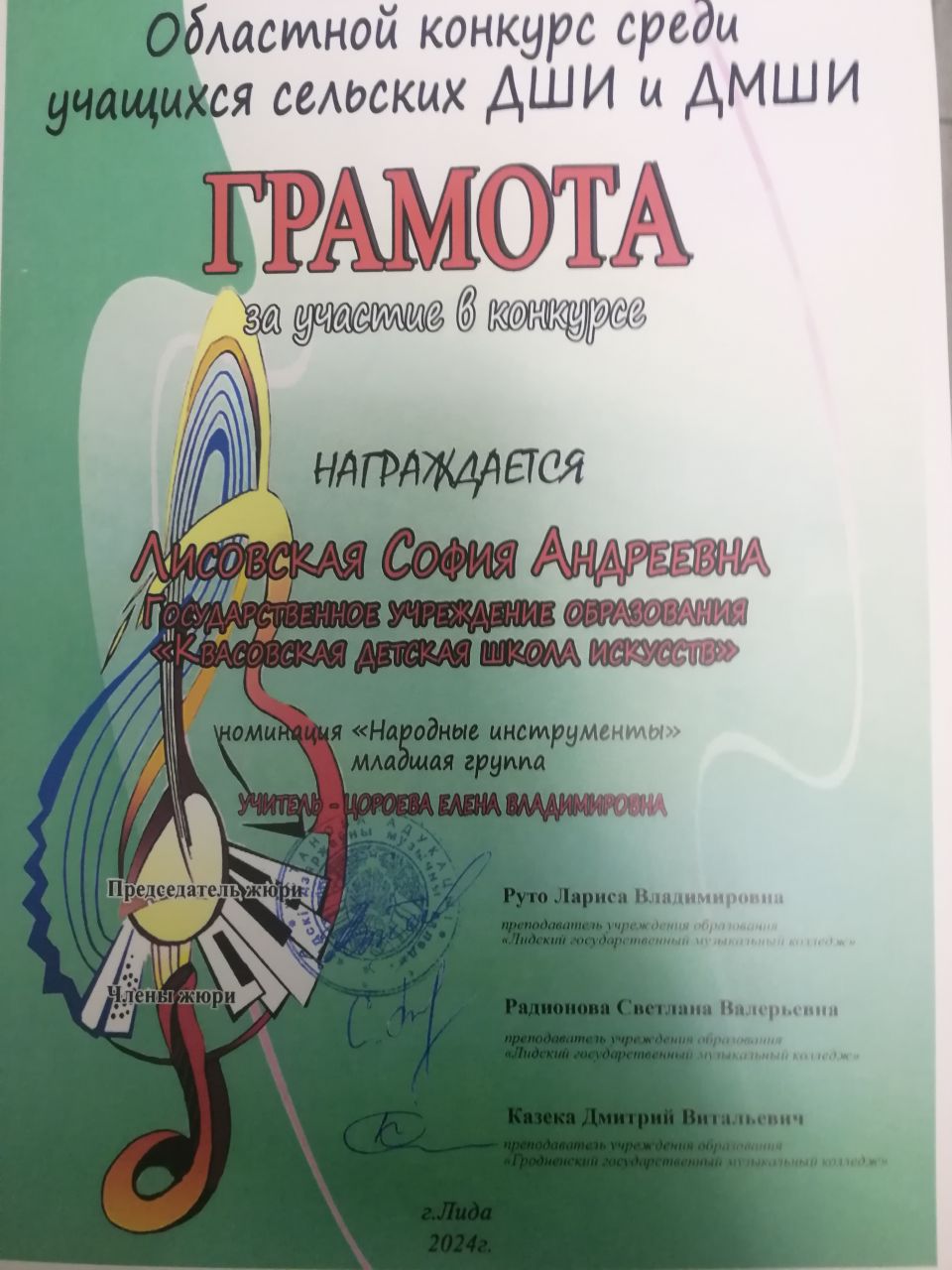 Вчера, 26 февраля на базе Лидского государственный музыкальный колледж состоялся областной конкурс среди учащихся сельских ДШИ и ДМШИ, где в номинации "Народные инструменты" в младшей возрастной группе приняла участие Лисовская София, воспитанница учителя Цороевой Е.В. Высокий груз ответственности представлять наше учебное заведение и самая многочисленная номинация по количеству участников внесли свои коррективы в выступление Софии и не позволили ей попасть в число призеров. По итогам конкурса Софии вручена Грамота за участие. Однако юная конкурсанта не теряет оптимизма и вместе со своим учителем активно готовится с очередному серьезному конкурсу, который пройдет также на Лидской земле в марте месяце.