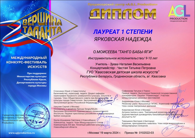 19 марта учащаяся Ярковская Надежда (учитель Зуева Н.В., концертмейстер Чистая Т.П.) успешно приняла участие в международном конкурсе-фестивале искусств «Вершина Таланта» (г.Москва), где была отмечена председателем жюри, как конкурсантка с хорошим потенциалом и награждена дипломом Лауреата I степени. Поздравляем!
