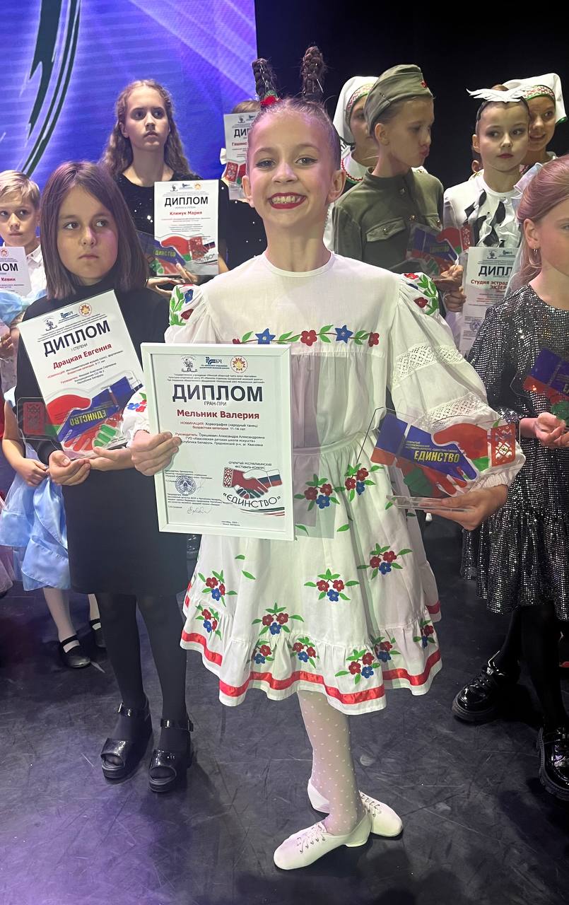 Успешным выступлением открыл учебный учебный год 2024-2025 класс хореографии, задав высокую планку для всех учащихся школы, принимающих участие в конкурсах. Сегодня, 29 сентября, в столице нашей страны, городе Минск, прошел II Открытый Республиканский фестиваль-конкурс «ЕДИНСТВО-2024», в котором приняла участие Мельник Валерия, воспитанница учителя Орешкевич А.А. В номинации "народный танец" она стала лучшей и была награждена дипломом ГРАН-ПРИ. Поздравляем с отличным результатом и желаем дальнейших побед!!!