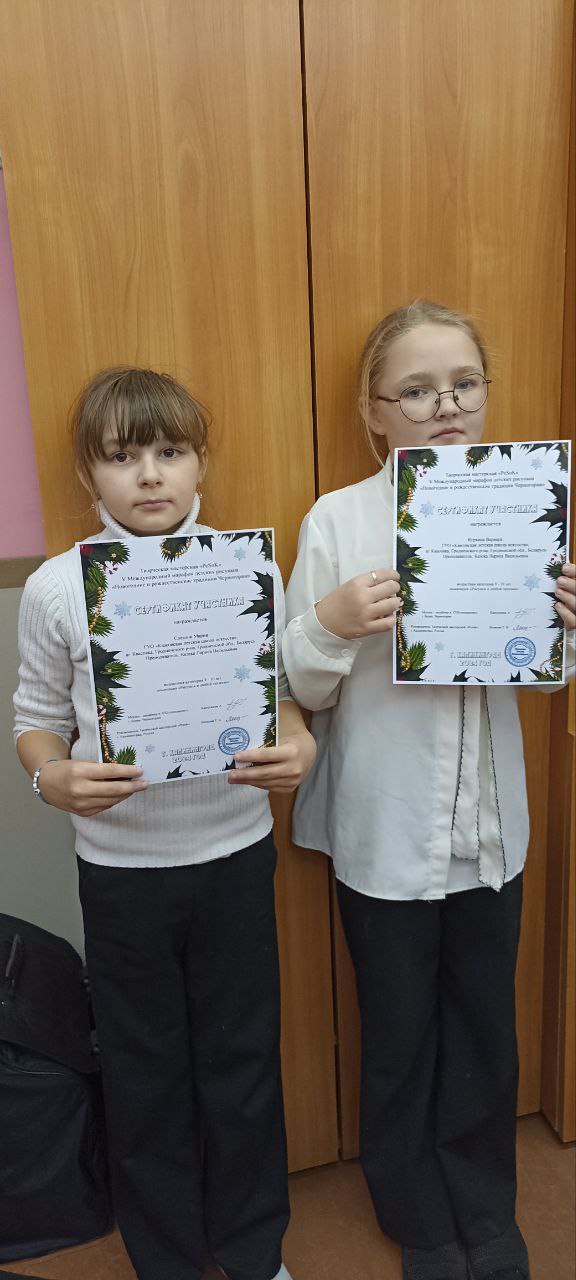 Даша заняла почетное 3 место в этапе марафона "Новогодние традиции Шотландии" и 2 место в этапе "Новогодние традиции Черногории". Левченкова Есения, Куркина Варвара и Слезник Мария получили дипломы участников. Поздравляем девочек и их учителя Казека Ларису Васильевну с заслуженной победой!
