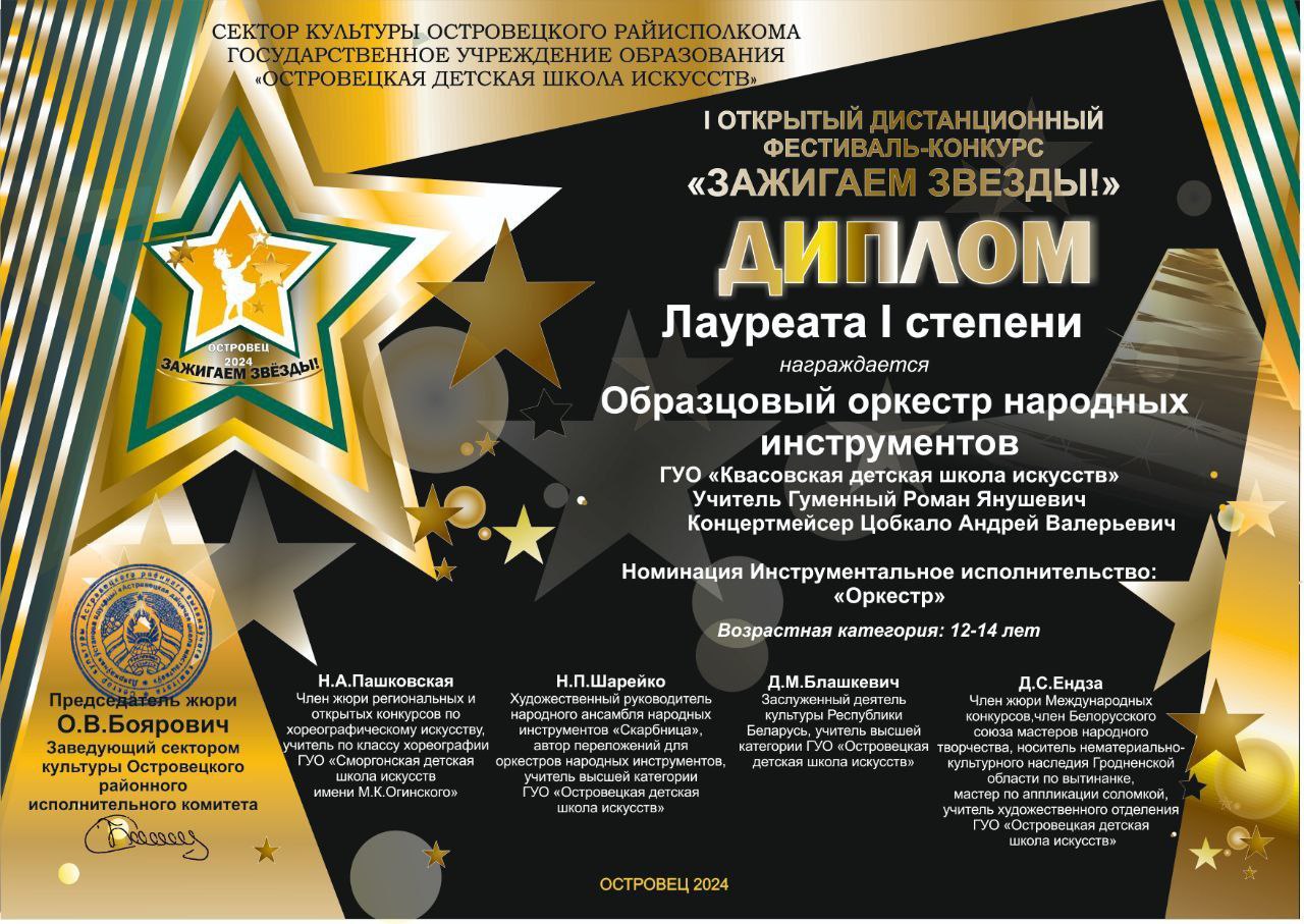 В декабре подвёл свои итоги I Открытый дистанционный фестиваль-конкурс "Зажигаем звезды", который проходил в городе Островец. Приятной новостью стала победа Образцового оркестра народных инструментов под руководством Гуменного Р. Я. - Диплом Лауреатов I степени.
