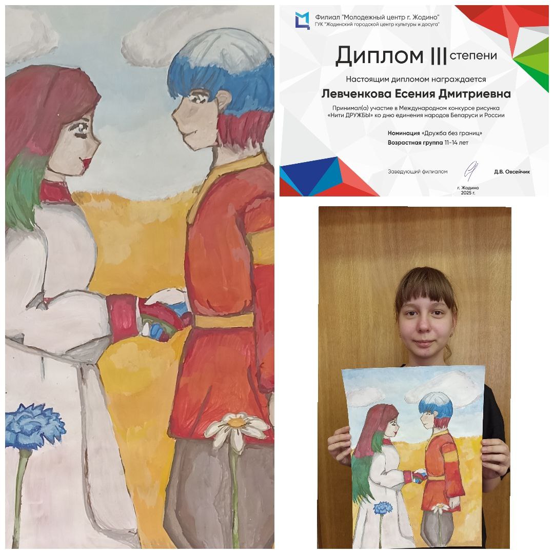 Юные художники нашей школы приняли участие в Международном конкурсе рисунка "Нити Дружбы" ко Дню единения народов Беларуси и России , который проходил в г.Жодино. Работа в номинации "Дружба без границ" принесла учащейся 5 класса Левченковой Есении Диплом 3 степени! А Венсковский Никита ( 1 класс) получил диплом участника конкурса в номинации " Общие ценности"! Поздравляем учащихся и их учителя Казека Л.В. с заслуженной наградой!