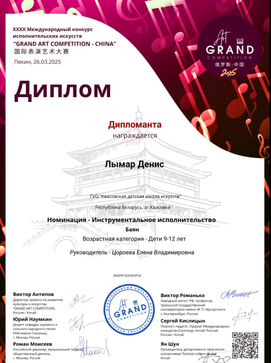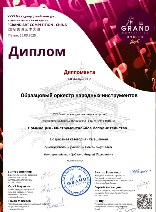 Подведены итоги XXXX Международного конкурса исполнительских искусств «GRAND ART COMPETITION – CHINA», который проходил в заочной форме в г.Пекин (Китайская Народная Республика), где свои исполнительские навыки продемонстрировали представители инструментального отделения. В номинации «Инструментальное исполнительство» выступил образцовый оркестр народных инструментов под руководством Гуменного Романа Янушевича и учащийся по классу баяна Лымар Денис (учитель-Цороева Елена Владимировна). По итогам конкурса оба участника были удостоены дипломов «Дипломантов». Поздравляем и желаем новых творческих достижений!