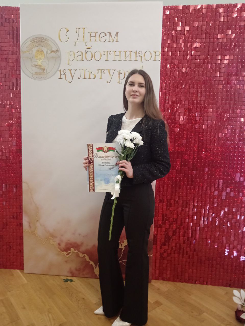 Учитель нашей школы искусств, Кощиц Юлия Сергеевна, получила Благодарность от начальника отдела культуры Гродненской райисполкома Кузьмы Т. Н. за высокий профессионализм и творческую деятельность, значительный вклад в развитие и пропаганду белорусской культуры. Поздравляем Юлию Сергеевна с заслуженной наградой, а всех коллег с профессиональным праздником! Пусть ваша преданность профессии, энергия, неравнодушие, целеустремлённость всегда помогают вам на творческом пути! Желаем неиссякаемой энергии, увлечённые учеников и блистательных успехов в вашей профессии!
