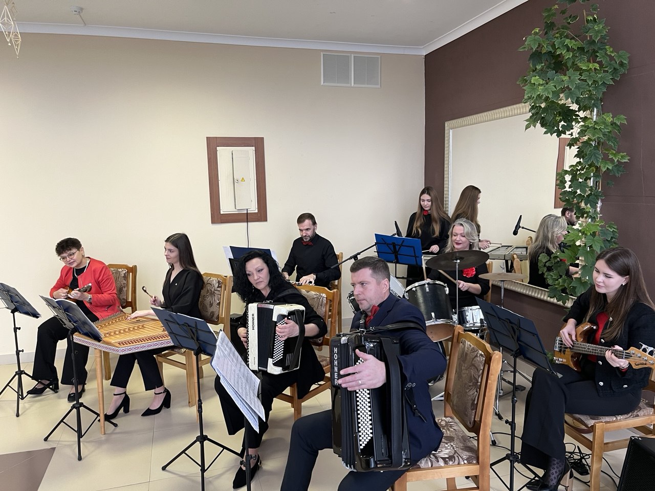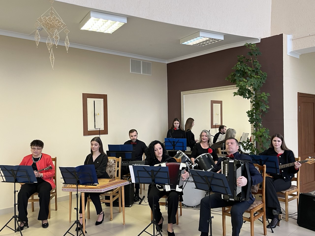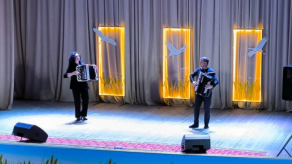 Творческие коллективы нашей школы искусств также подготовили свои поздравления. В фойе центра культуры зрители смогли насладиться выступлением инструментального ансамбля учителей, создававшим музыкальную атмосферу праздника, а на сцене дуэт баянистов и солистки детского танцевального коллектива "VSPLESK" Балтушникас Инесса и Мельник Валерия подарили публике яркий музыкальный номер "Купалле" и хореографическую композицию "Подружки".