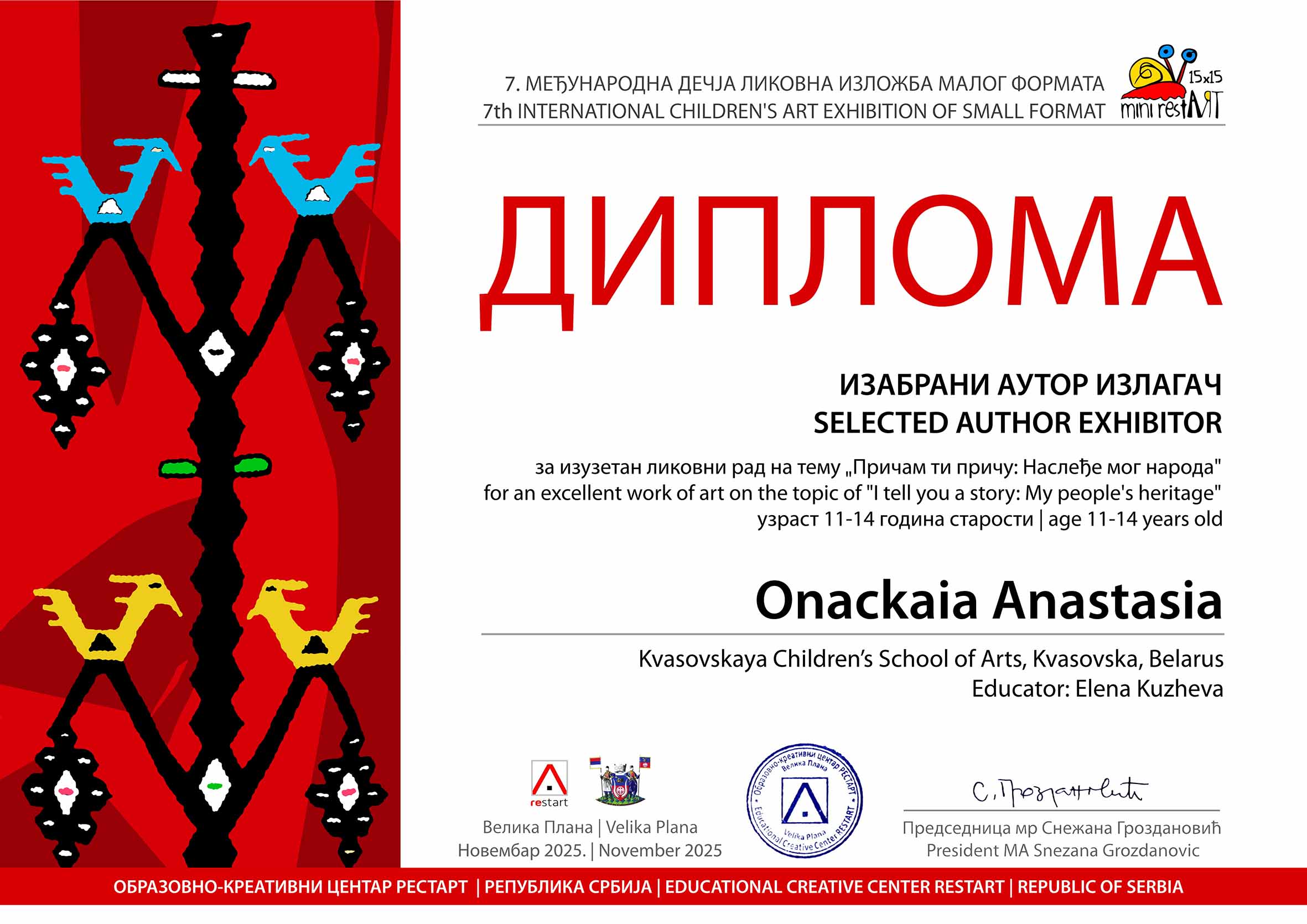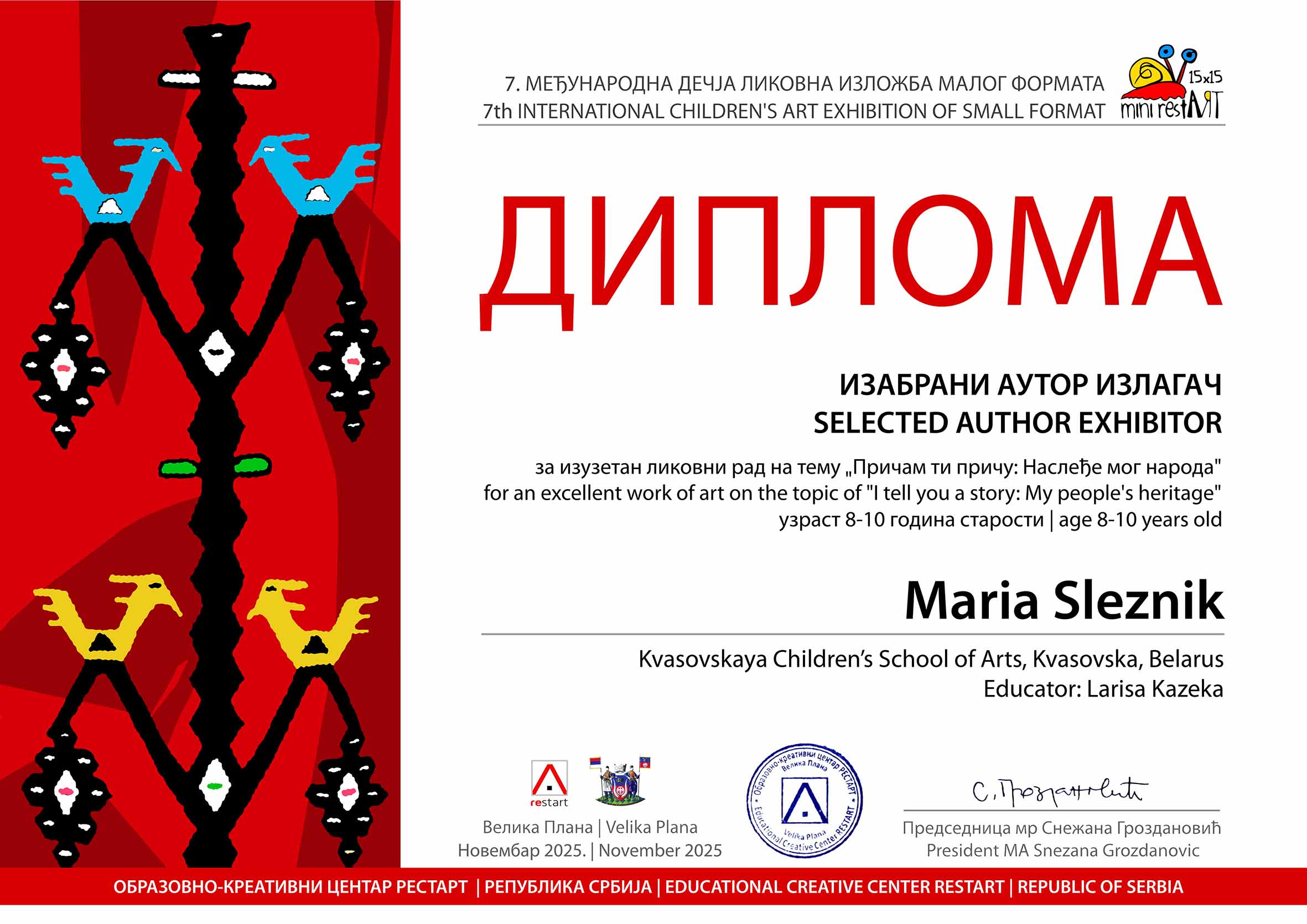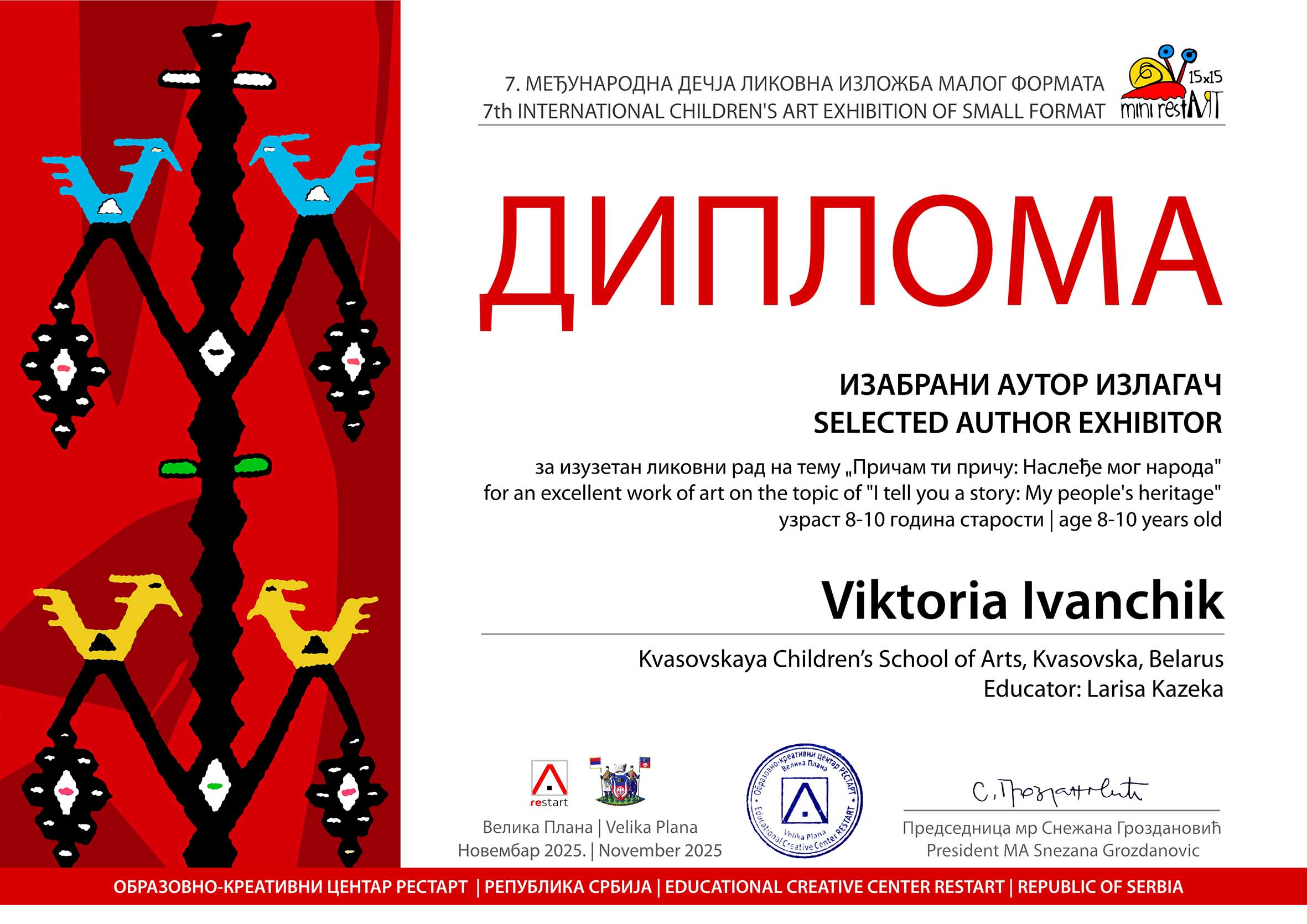 И вновь юные художники нашей школы доказали, что талант не знает границ! Их работы были высоко оценены жюри и вошли в экспозицию итоговой выставки 7 Международного конкурса детского творчества малого формата «Mini restART 2025» г.Велика Плана (Сербия).