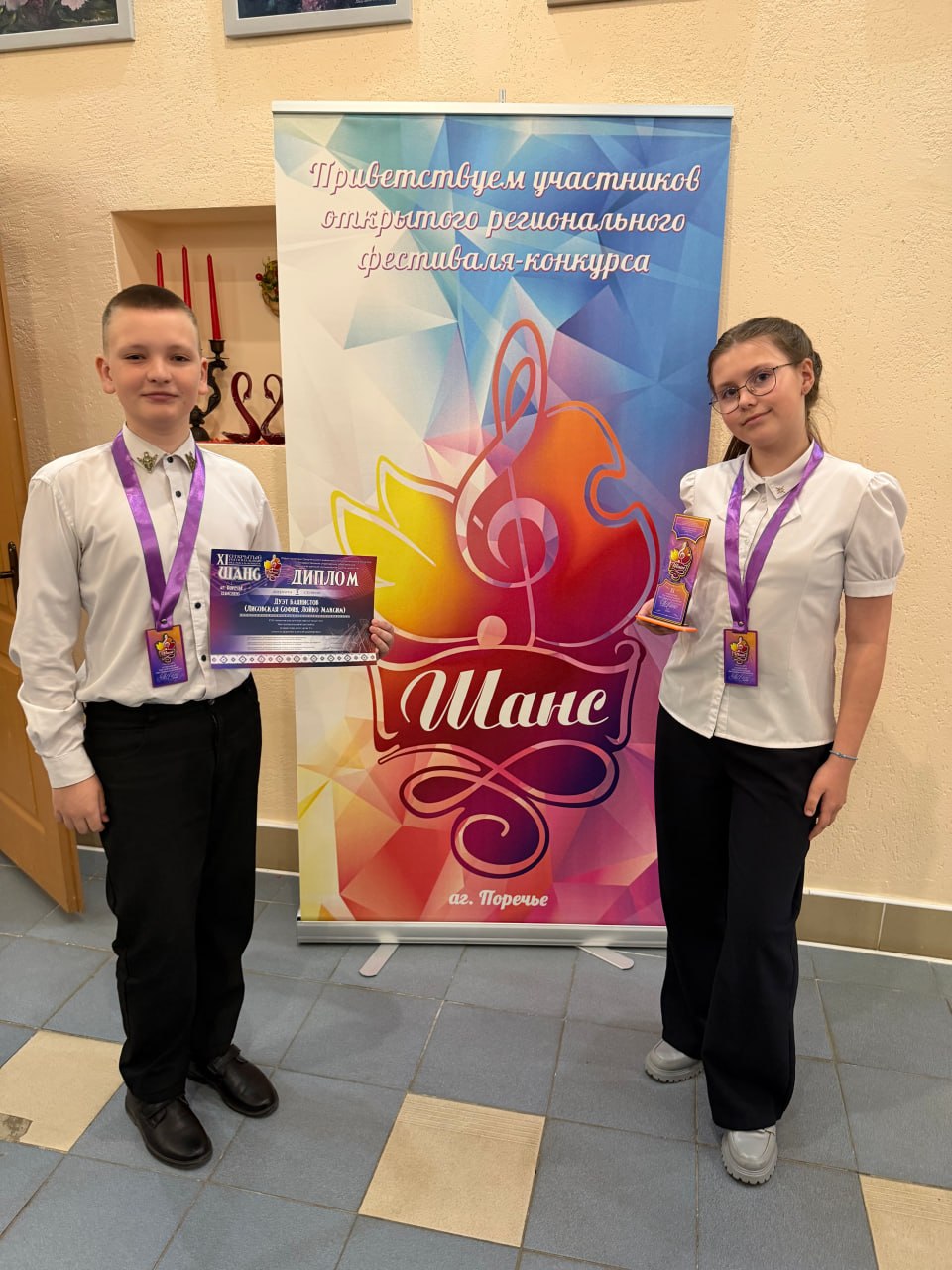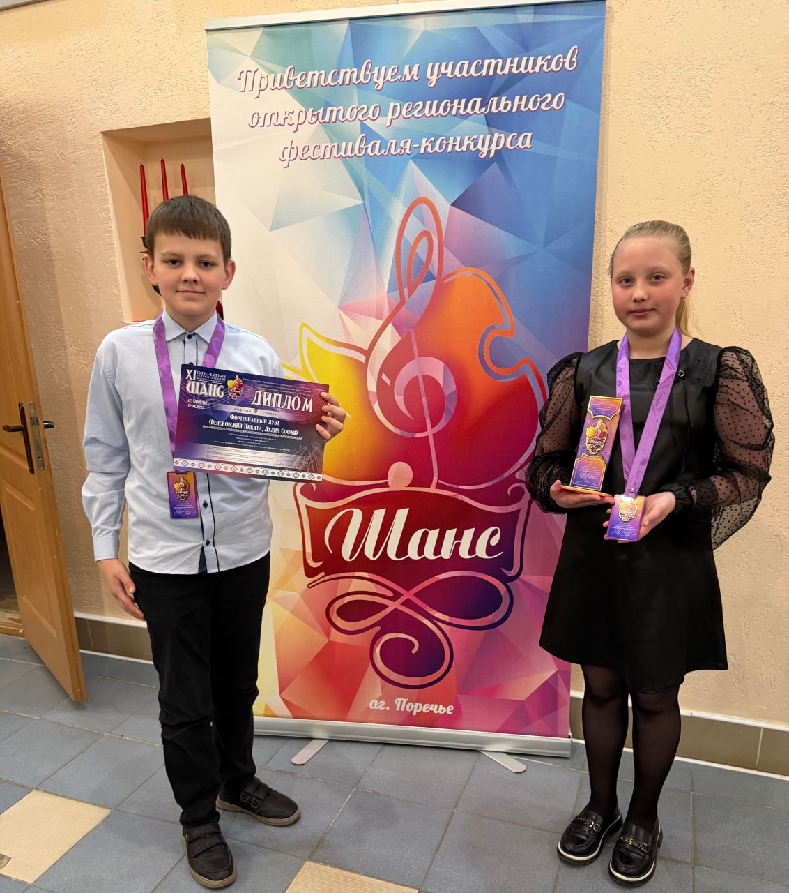 Творческое вдохновение по-прежнему не покидает учащихся инструментального отделения нашей школы искусств, и очередным подтверждением этому стало их участие во втором дне конкурсных прослушиваний IX Открытого регионального фестиваля-конкурса "Шанс", состоявшегося 17 апреля 2026 года в Поречской детской музыкальной школе искусств. В номинации "инструментальный ансамбль" фортепианный дуэт в составе Дудич Софьи и Венсковского Никиты (учителя Кощиц Ю.С. и Ельяшевич М.Г.) был удостоен диплома Лауреата 3 степени, а дуэт баянистов Лисовская София и Лойко Максим (учитель Цороева Е.В.) завоевал диплом Лауреата 2 степени. Поздравляем ребят и их наставников с замечательным результатом и желаем нашим конкурсантам не останавливаться на достигнутом.