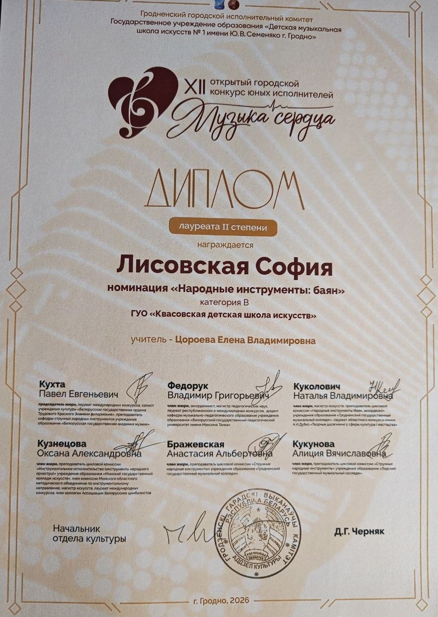 Минувшая суббота, 18 апреля, пополнила нашу школьную копилку ещё одной наградой. Учащаяся по классу баяна из агрогородка Свислочь Лисовская София (учитель Цороева Е. В.) достойно представила наше учебное заведение на XII открытом городском конкурсе юных исполнителей "Музыка сердца", который состоялся в ГУО "ДМШИ №1 имени Ю.В. Семеняко" города Гродно. По итогам конкурсных прослушиваний юная исполнительница была удостоена диплома Лауреата II степени. Поздравляем Софию и её наставника со значимым достижением и желаем новых побед, творческого вдохновения и успешных выступлений.